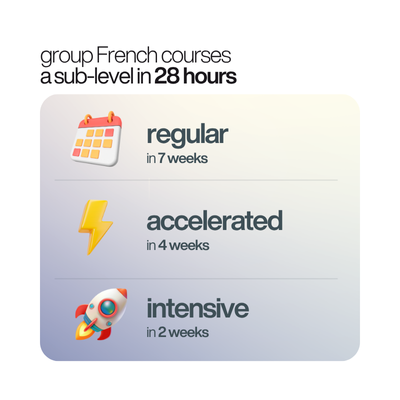 - Take part in 28-hour sessions of regular (7 weeks), accelerated (4 weeks) or intensive (2 weeks) French language training.