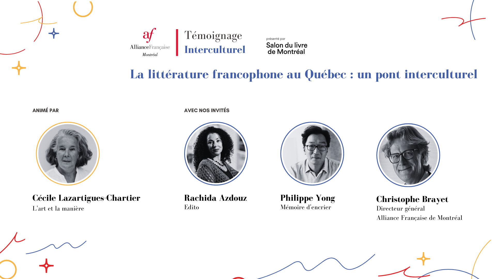 Rencontre avec deux auteur.rices, le directeur de l’Alliance Française de Mtl et une experte en interculturel qui, de par leur engagement et leurs origines, permettent de mieux comprendre comment la langue française et la littérature sont des traits d’union interculturels très puissants. Du mieux vivre ensemble à l’essence de la rencontre humaine, comment la littérature peut enrichir le partage qui fait sens et permettre de bâtir un espace interculturel où chacun peut prendre sa place.